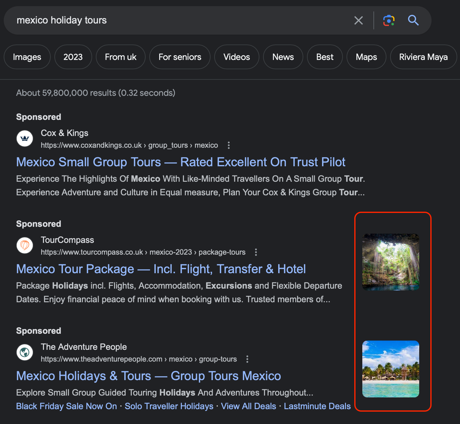 Here is an example, although the two ads using image extensions rank second and third in the search results, they still achieve a better user experience than the ad in first place.